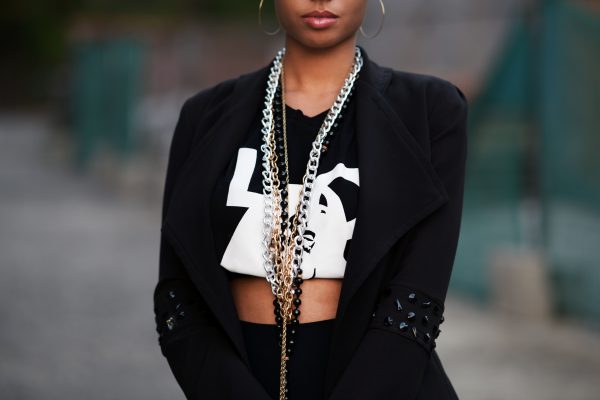 KEVIN ALLWOOD “BLACK CRYSTAL” fitted Blazer with asymmetrical lapel and crystals sewn into the elbows.